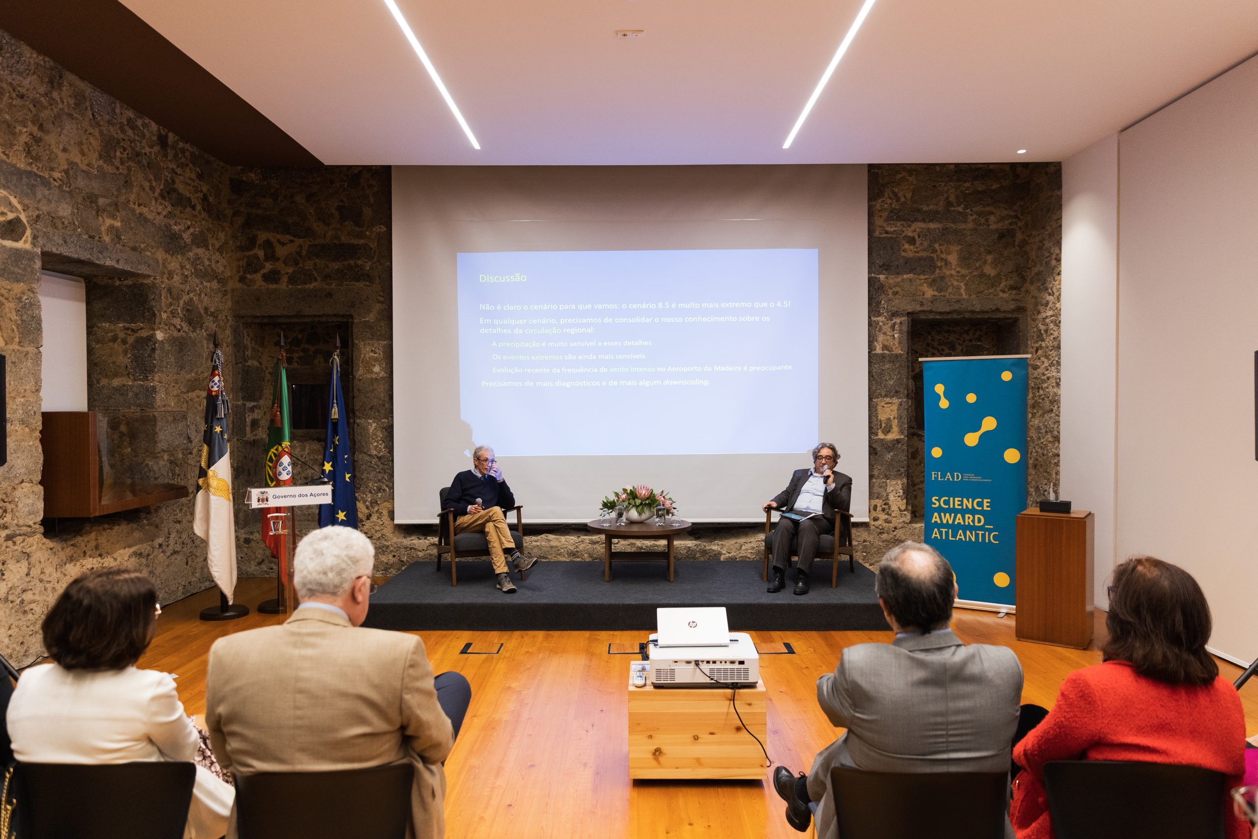 After the opening session, there followed a debate on “Climate change in the NE Atlantic and the Azores” with Pedro Miranda, Professor at the Faculty of Science, University of Lisbon, and Ricardo Serrão Santos, from OKEANOS, University of the Azores.